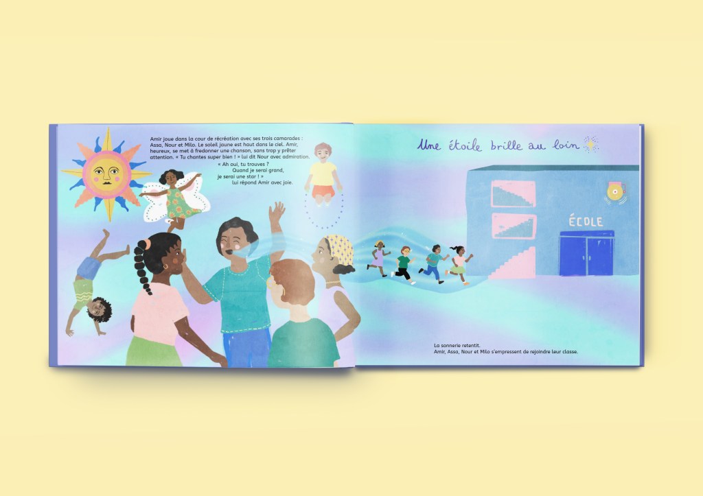 Un bonheur à lire avec Bout’Chou qui partage avec Amir, la passion des couleurs, des paillettes, du vernis à ongles, mais aussi des origines culturelles… C’est toujours aussi rare, et donc précieux, de voir dans la littérature jeunesse un enfant, assigné garçon à la naissance, évoluer de manière peu conforme aux normes de genre, a fortiori un enfant racisé « arabodescendant » !