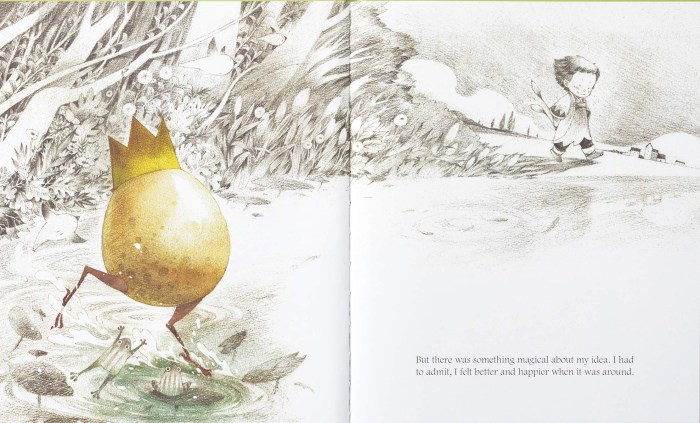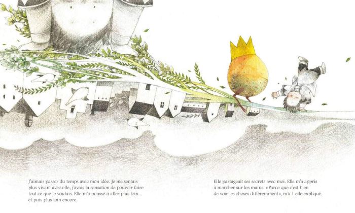 Avoir une idée nous force souvent à changer de paradigme, ce qui est plusieurs fois proposé non seulement par le texte mais surtout par l’illustration. L’enfant grandit tout autant que son idée et c’est tellement beau à voir.