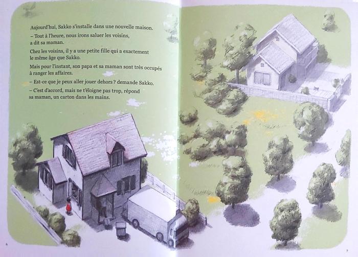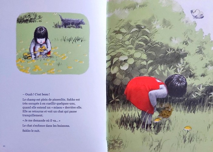 Sakko est impatiente de rencontrer sa nouvelle voisine, mais elle est sortie. En attendant, elle découvre les environs, un champ, un chat, et… une jolie cabane de feuilles. Un petit panier contenant tout un set de dinette l’attend, mais pas de petite voisine. Alors Sakko retourne dans les champs pour cueillir des pissenlits et des fleurs de trèfles et les déposer sur le panier.