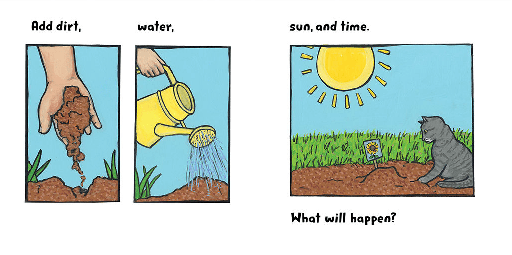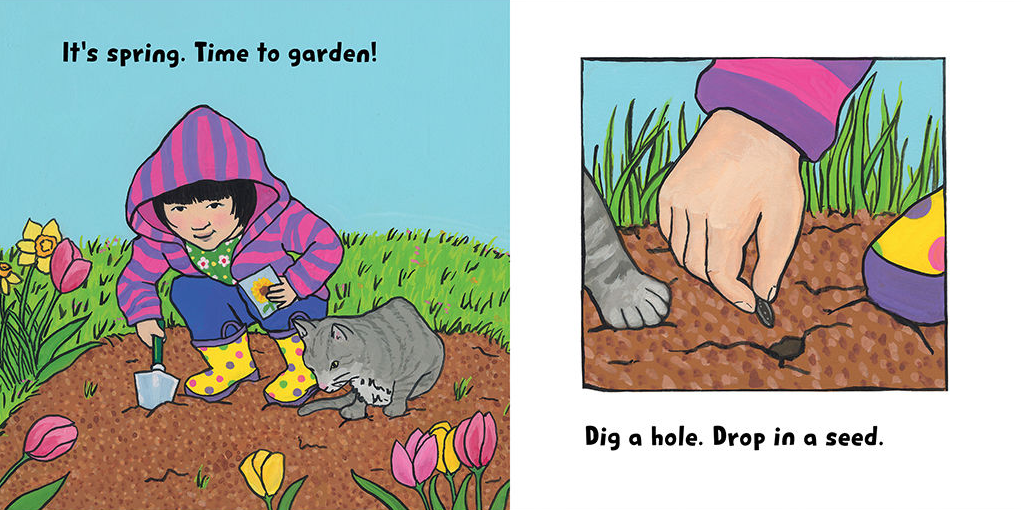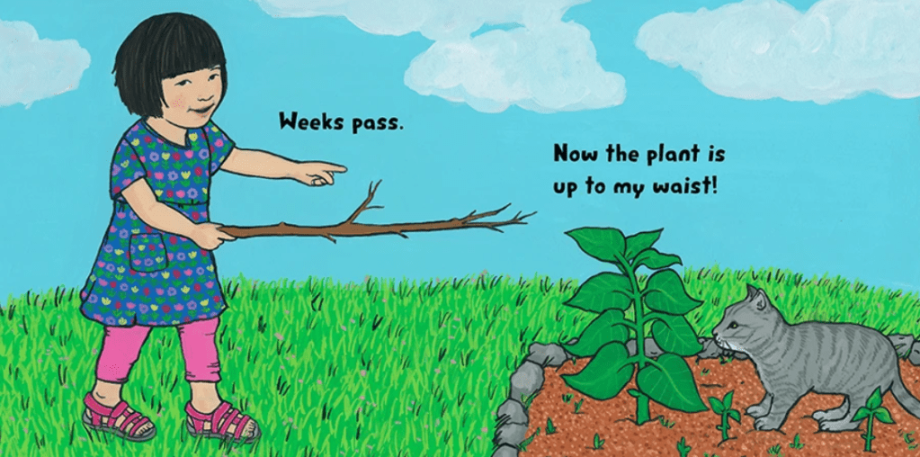 Mai plants a seed and watches it grow. Soon the little plant is up to her toes, then her kneew, then her waist. How tall will it get ?