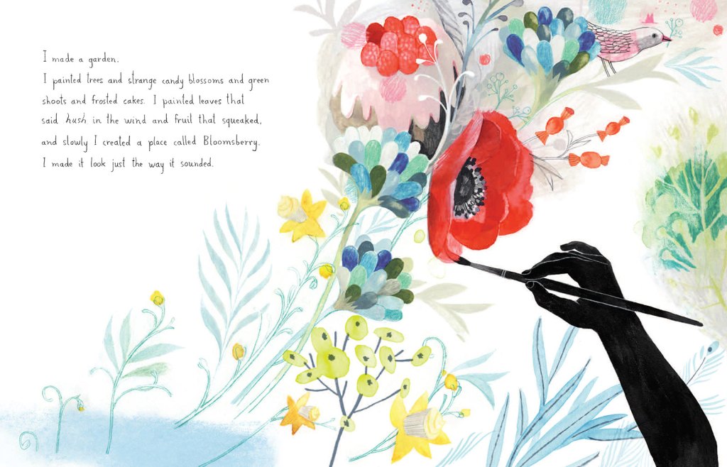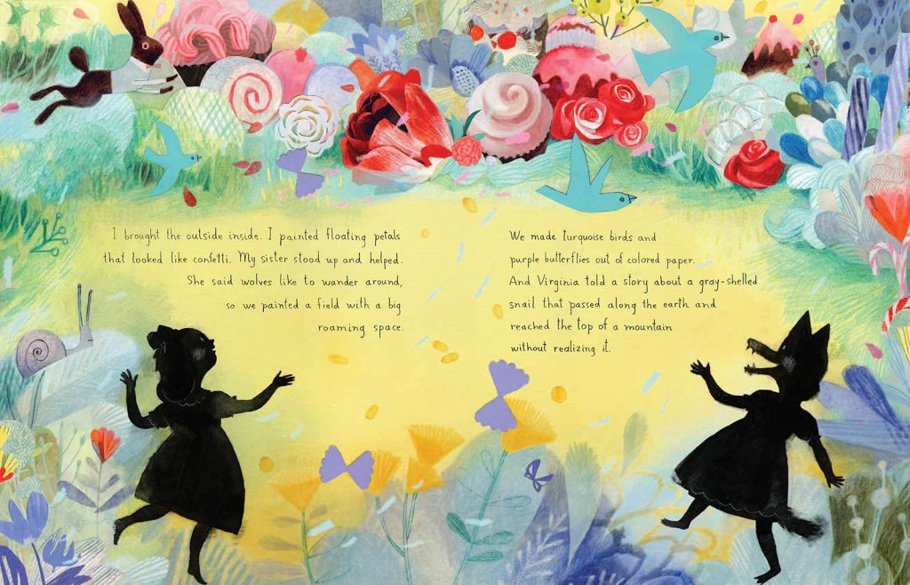 C’est parti, Vanessa commence à peindre Bloomsberry sur les murs de la chambre, les transformant en un magnifique jardin avec une échelle et une balançoire « pour que ce qui était en bas puisse monter ». Et cela fonctionne ! Rapidement Virginia reprend des couleurs et son état s’apaise grâce à l’univers de Bloomsberry, comme un safe space, magnifiquement illustré par Isabelle Arsenault.