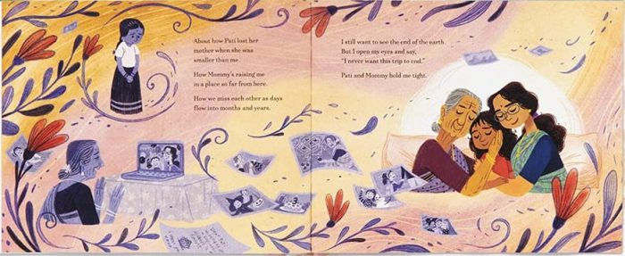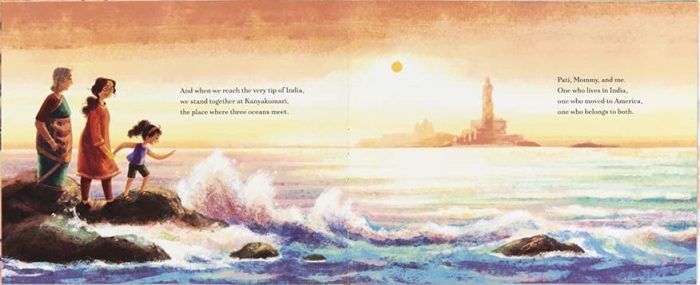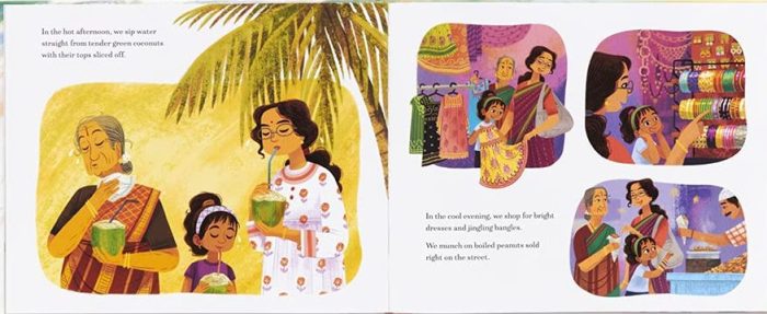 Cet album s’inspire de l’histoire de l’autrice, née à Bangladore, capitale de l’Etat de Karnataka, et dont la famille a émigré aux EUA, et notamment d’un voyage qu’elle a fait avec sa famille dans le sud de l’Inde. L’illustratrice est également originaire de Bangladore où elle vit toujours avec sa famille et a inclus de magnifiques détails qui, pour elle, sont symboles nostalgiques :