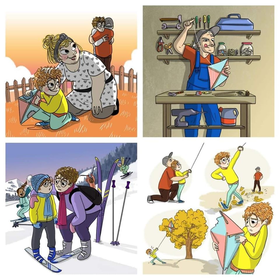 « Au ski avec Papa » et « Le cerf-volant de Papi », deux petites histoires pour appréhender avec douceur les moments où on ne se sent “pas à la hauteur” et où le regard des autres est difficile et mettre en avant l’hypersensibilité comme un super pouvoir.